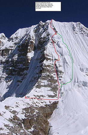 2 - Главният връх на Дромо. С черни точки е отбелязан маршрутът на Скот-Миър, а с червена – на Кожель-Шорн, със зелено означено слизането им (Mitja Šorn/ alpinist.com)