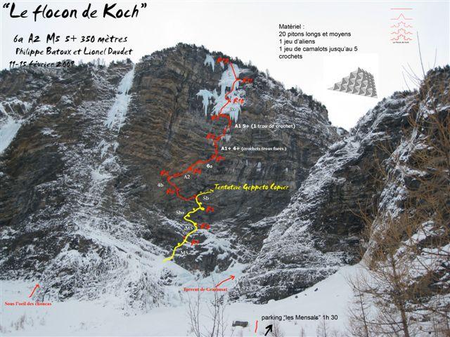 Изкачването им продължи пет дни – от 11 до 15 февруари. Така се появи “Le Flocon de Koch” (6a, A2, M5, 5+, 350 м). “Ръкавицата е хвърлена към всички, защото стои въпросът кой ще изкатери линията без употреба на изкуствени опорни точки” – писа Бату.