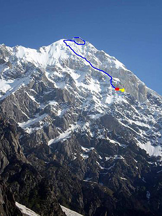 Горната част на южната стена на Карим Шар с обозначение на лагера и линията на изкачването