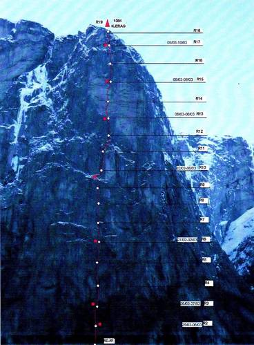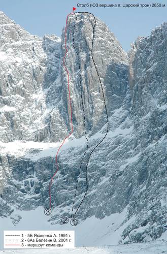 Първо изкачване, първо зимно, 6B категория, И. Шерстньов, С. Лягин, А. Синюшкин, А. Шелковников (няма фотография)