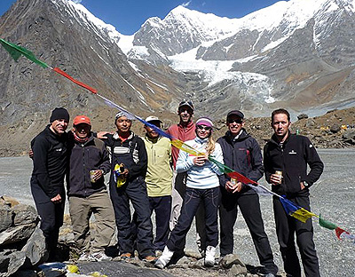 В базовия лагер на Анапурна – отляво: Петер Хамор, трима шерпи, Жоао Гарсия, Кинга Барановска, Пьотр Пустелник и Хория Колибасану