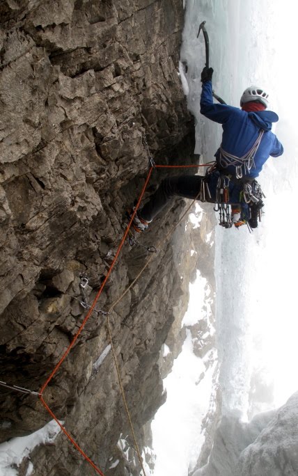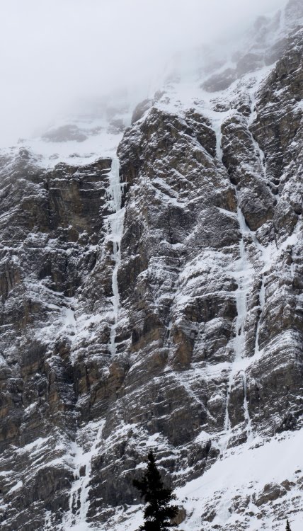 Стената на Тангъл Ридж (Tangle Ridge) с новите маршрути от май и април 2010 г., следващи виждащите се на снимката ледопади – от ляво: “Undertow”(WI6), “Can' t Touch This” (WI5+ M6) и “Boobquake” (WI4+ M5)
