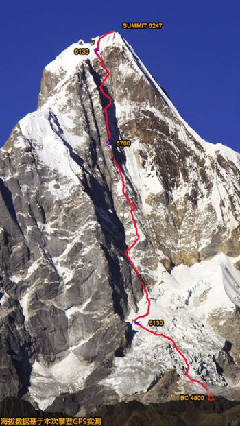 Стената вдясно, която беше премината за първи път от 4 до 8 май 2010 г. от южнокорейците; маршрутът е дълъг 2500 м със спускане по източния гребен