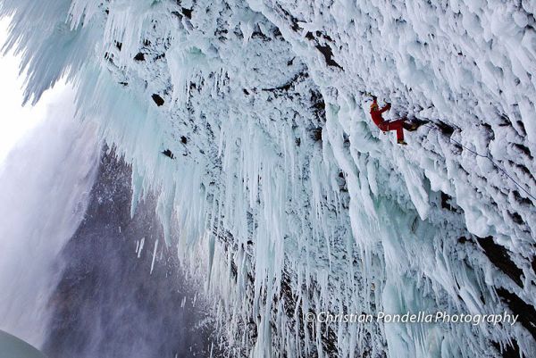 “Spray On” върви по тавана на впечатляваща пещера Хелмккън (Helmcken) във Wells Grey Provincial Park, в Британска Колумбия (Канада). Уил Гед (Will Gadd) и Тим Емит (Tim Emmett) прибавиха поредни въжета към тази най-трудна ледена линия в света.