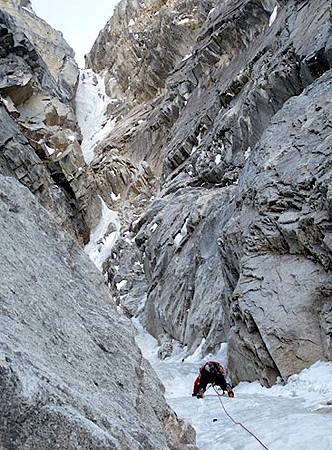 След преминаването с взаимна осигуровка на първите 600 метра по стръмен снежен терен, двамата навлязоха в леден кулоар, по който вече използваха последователно осигуряване. Вечерта на първия ден бивакуваха 300 м под върха. След студена нощ продължиха нагоре, сблъсквайки се с трудности до WI5 по ледените пасажи.