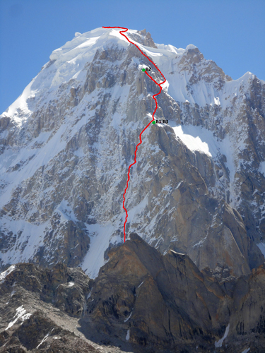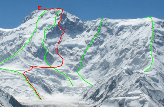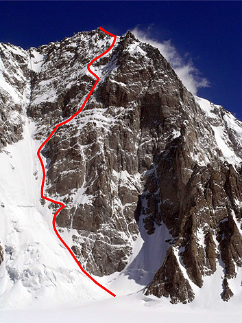 Северната стена на пик Победа – отляво надясно са Маршрутът на Абалаков (1956), "Dollar Route" (1982 г., отбелязан със зелена линия), “Dollar Rod” (2011 г., с червена линия), “Camel Buttress” (2009 г.) Класическият маршрут по западния гребен (1961 г.).