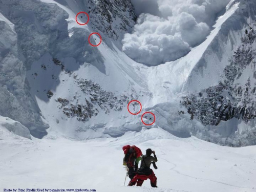 Подобен инцидент е наблюдавал и е успял да заснеме на 18 април американският алпинист и фотограф Дон Бауи на Анапурна, когато гигантска лавина връхлетяла върху шестима алпинисти и всичко изглеждало ужасно. Няколко секунди по-късно се оказало, че шестимата са останали извън обсега й са се отървали само със силна уплаха.