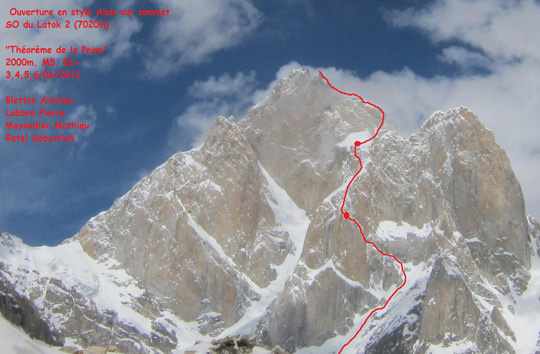 Френските алпинисти Матийо Мейнадие (Mathieu Maynadier), Антоан Блетон (Antoine Bletton). Пиер Лабр (Pierre Labbre) и Себастиан Рател (Sébastien Ratel) прокараха нов маршрут по югозападната стена на Латок-2 (Latok II, 7108 м) “Theoreme de la Peine” (M5, ED-) и по този начин откриха новия летен сезон в планините на Пакистан.
