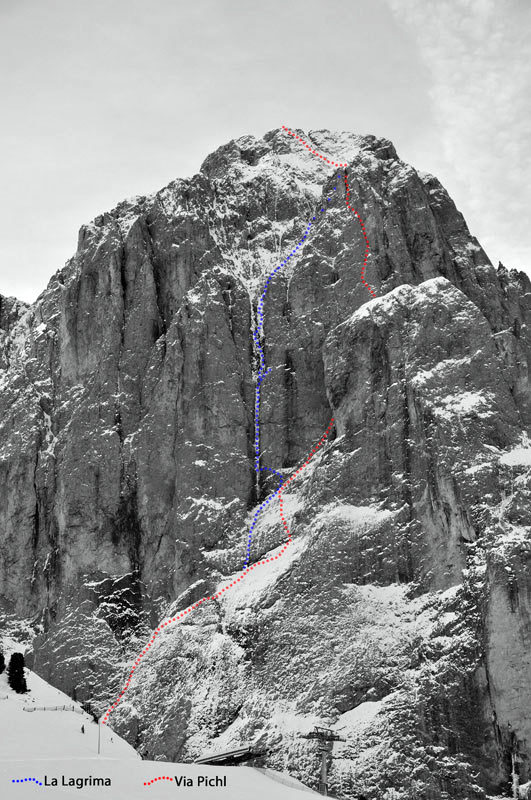 Този 1000-метров тур по една от най-разпознаваемите стени в Доломитите беше цел на редица отлични катерачи по лед. Но едва през този януари настъпи съчетание на благоприятни условия за преминаване по ледената нишка и се намери, свръзка, готова да отговори на предизвикателството.