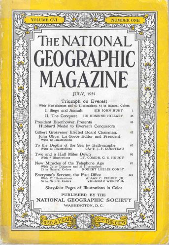Днес се навършват 60 г. от паметното първо исторически документирано изкачване на най-високия връх в света – Маунт Еверест (8848 м). Една от първите публикации за това събитие, което по своя отзвук в света може да се сравнява единствено с първия полет на Юрий Гагарин в Космоса през 1961 г. и първото стъпване на Луната на Нийл Армстронг през 1971 г., се появява в юлския брой на “The National Geographic Magazine” за 1954 г.