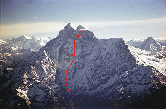Южната стена на Гауришанкар с маршрута и биваците на французите