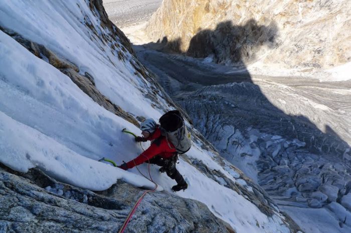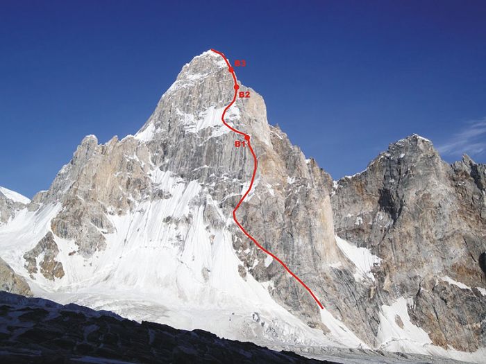 Ондрей Мандула и Иржи Плиска организираха базовия си лагер на 22 юни т. г. на мястото, известно като Морфо Горо (Morpho Goro), на страничната морена на ледника Биафо. Преминаването на 35-те въжета в алпийски стил по 1600-метровата югозападна стена и слизането обратно им отнеха шест дни (5-10 август 2013 г.), като на върха бяха на 8 август. Оценката на маршрута е 6b, A1, M5, 70 градуса на ледените пасажи.