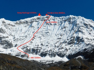 Испанско-словенският маршрут, прокаран на 21 и 22 октомври 2013 г. по югозападната стена на Канг Начуго, бе наречен “Monsoon” (1500 м, 75o).