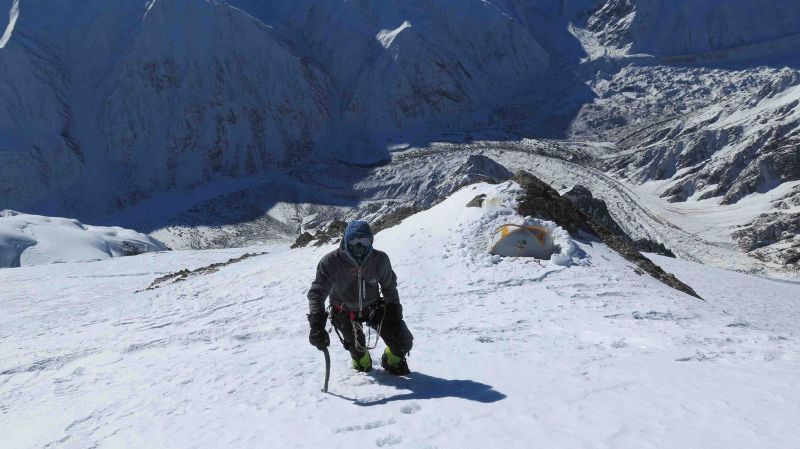 “Lasciando campo 3 per salire a circa 7000 prima di scendere e tronare a campo base a causa del sopraggiungere del freddo e del vento” – “Напуснахме лагер и тръгнахме към 7000 м преди са се върнем в базовия лагер заради студа и силния вятър”.