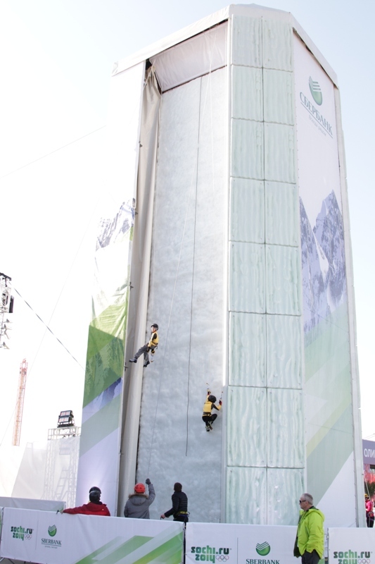 Една от най-големите атракции в съпътстващата програма на зимните олимпийски игри в Сочи е 17-метровата формация от естествен лед, която се намира в олимпийския парк, практически на брега на морето, заобиколена от палми под яркото слънце.
