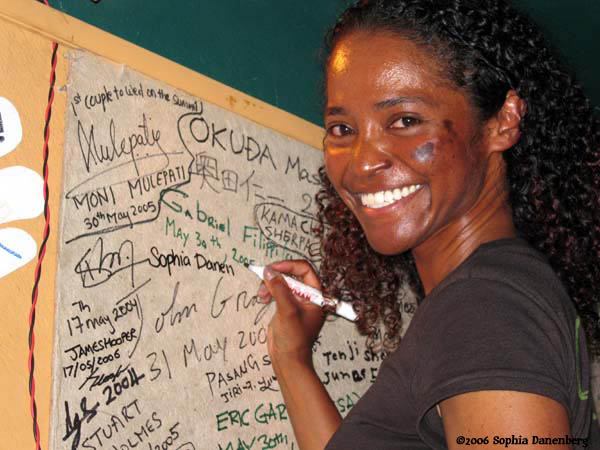 София слага подписа си на таблото на изкачилите Еверест в кръчмата