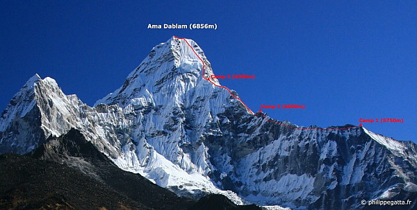 Югозападният ръб на Ама Даблам с трите височинни лагера
