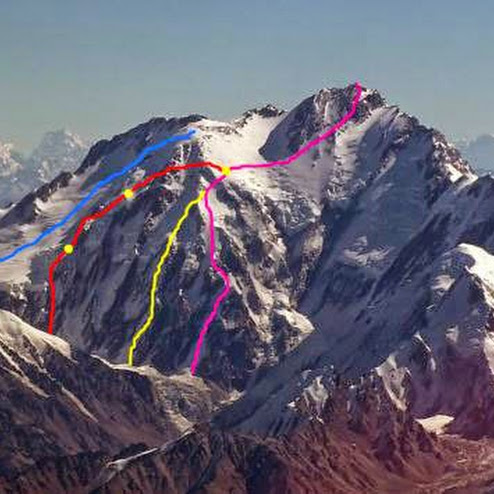 е Маршрутът на Меснер-Айзендле, с лилаво е маркиран Маршрутът