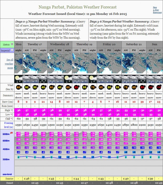 За съжаление, те няма да могат да бъдат предприети в скоро време. От вчера на Нанга Парбат с редки прекъсвания вали сняг, а прогнозата не предвижда скорошно поправяне на времето...