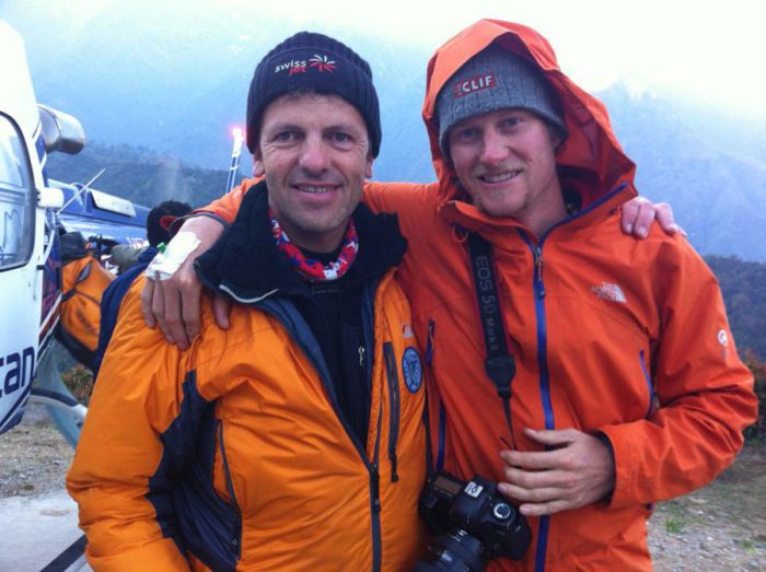 Маурицио Фолини (вляво) и Кори Ричардс в Лукла след свалянето на последния по въздуха от