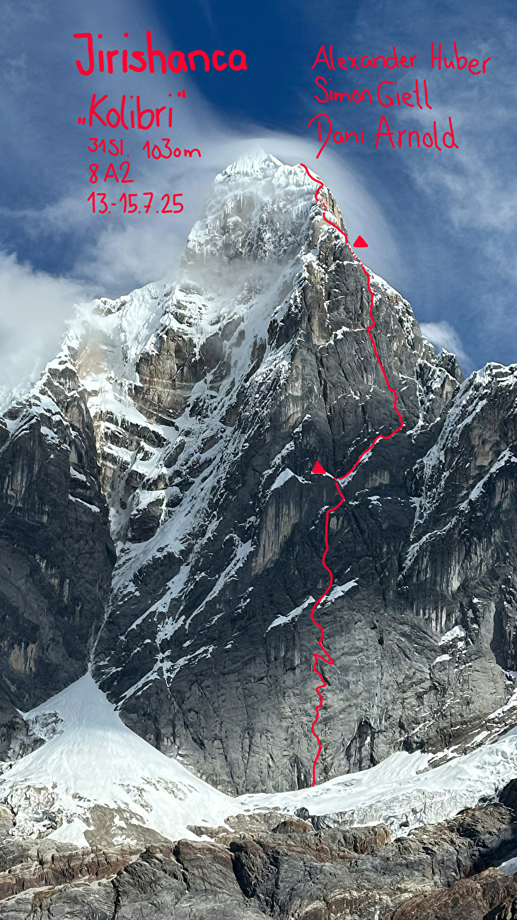 Отбор, състоящ се от едни от най-силните катерачи в света Алекс Хубер (54 г.), Симон Гитл (40 г.) и Дани Арнолд (41 г.), направи нов маршрут до връх Джиришанка-Изток (6028 м) в Перу. Линията "Колибри" (1030 м, 8, А2) е 31 въжета и е по източната стена на този шестхилядник. Направена е с два бивака на стената и изисква технично катерене, силова издръжливост и психическа ангажираност, разказват нейните автори, цитирани от Exploreresweb.